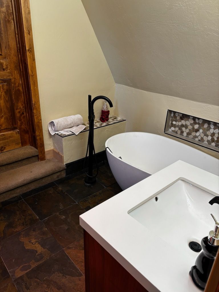 In larger bathrooms, a freestanding tub serves as a striking focal point, perfect for a relaxing soak after a day in the mountains.